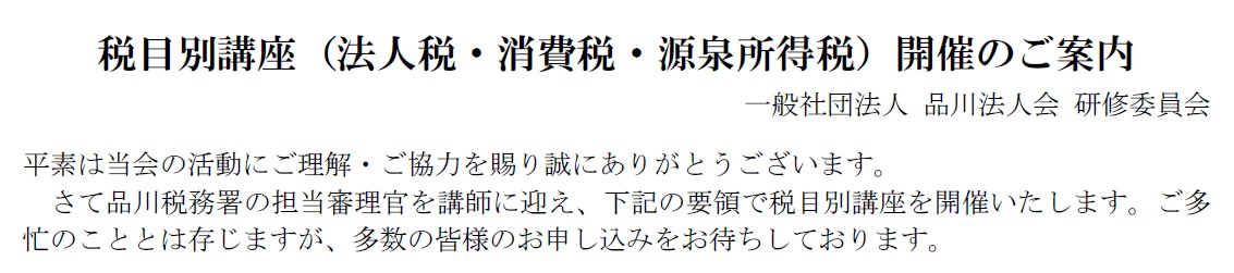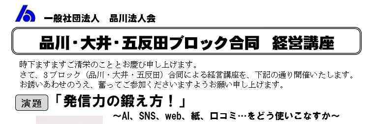昭和24年から、品川・大井・五反田の、約2,100社が集まり、地元や企業の発展に繋がるお手伝いを行っています。福利厚生、税務、社会貢献、異業種交流を主な活動としており、6委員会、3部会にわかれて、研修、仲間作りができ、経営上の問題解決にも役立ちます。賛助会員制度により、他地域の方も参加可能です。ぜひとも、品川法人会にご入会いただき、企業経営にお役に立てればと思います。