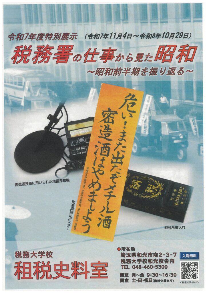 税務大学校租税史料室令和7年度特別展示について(品川税務署より) 投稿日 2025-11-27 著者 品川法人会ウェブ管理者 カテゴリー お知らせ 「税務署の仕事から見た昭和~昭和前半期を振り返る~」案内チラシ 現在、税務大学校租税史料室において、令和7年度特別展示「税務署の仕事から見た昭和~昭和前半期を振り返る~」が開催されています。 詳細は下記リンク先でご確認ください。 令和7年度特別展示「税務署の仕事から見た昭和〜昭和前半期を振り返る〜」|国税庁www.nta.go.jp この記事を書いた人 品川法人会ウェブ管理者 記事一覧 ウェブサイト